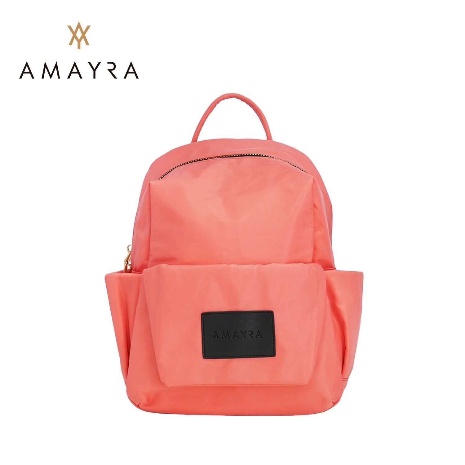 Mochila tamaño S con un compartimento principal con cierre, dos bolsillos laterales, un bosillo delantero con solapa, un bolsillo trasero con cierre y tres bolsillos interiores.