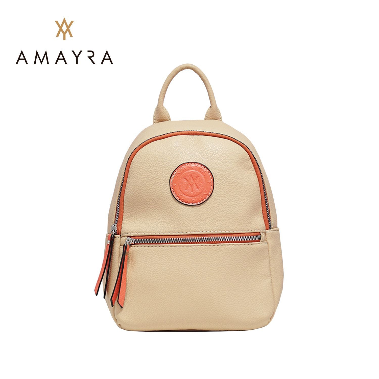 Mochila tamaño S con un compartimento principal con cierre, un bolsillo delantero con cierre y tres bolsillos interiores pequeños.